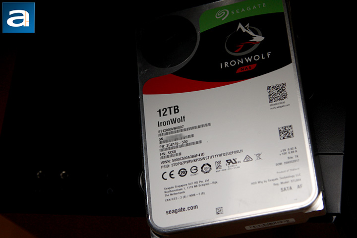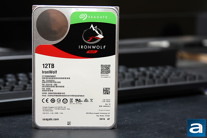 As always, with our storage reviews, before we move on to the benchmark results, let us briefly discuss the physical attributes of this hard disk drive first. The IronWolf ST12000VN0007 12TB is your quintessential 3.5" hard drive from Seagate; the top of the drive is bare metal with a dull silver finish and a large label placed across the middle. That said, the label has been updated to reflect Seagate's latest product branding, and the addition of color graphics make everything all the better. It is also nice to see the return of unique names, including IronWolf for NAS HDDs, FireCuda for SSHDs, BarraCuda for desktop HDDs, and SkyHawk for surveillance applications. The IronWolf we are reviewing today weighs in at 705g each, or about 1.55lbs. This is exactly the same as the BarraCuda Pro ST12000DM0007 12TB and IronWolf Pro ST12000NE0007 12TB according to the latest specifications sheet, both of which are equipped with relatively thin platters. On the label, you will spot information like its 12TB drive capacity, model name, serial number, model number, part number, firmware revision, manufacturing date, bunch of regulatory logos, and that it is a product of Thailand. The Seagate IronWolf series come with a three-year limited warranty.
