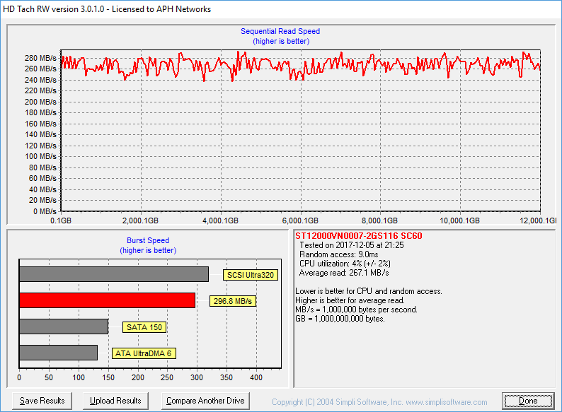 Now, it is the time for good old HD Tach. While HD Tach is more of a 'drag race' than a clear indication of real life performance, and has been around for a really long time, it is an excellent storage performance reference between hard drives for more than the last decade. Back in the days, if your average speed exceeded 60MB/s, you had a seriously fast drive. Where does the Seagate IronWolf ST12000VN0007 12TB come in? With an average read speed of 267.1MB/s and tested random access time of 9.0ms, this is mind-blowingly fast for a mechanical hard drive. But how does it compare against the other products? It is ahead of Seagate's own BarraCuda Pro 12TB at 256.2MB/s with a 9.2ms access time as well as the IronWolf Pro 12TB at 255.7MB/s with a 8.0ms access time. Meanwhile, the BarraCuda Pro ST10000DM0004 10TB came in at 243.4MB/s with a 9.4ms access time. The Seagate IronWolf ST12000VN0007 is the fastest mechanical hard drive ever tested in HD Tach here at APH Networks, but the IronWolf Pro 12TB has the best random access time of 8.0ms.