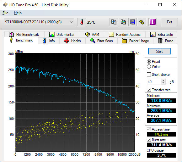 Unfortunately, HD Tune does not generate any fancy independent graph outputs in particular, so I only took a screenshot of the program to publish in this review. Somewhat unlike our HD Tach results on the previous page, the line was standard fare for a hard drive -- faster near the beginning, and slowly drops off as we move away from the center of the platter. It differed slightly in magnitude than the other program as well -- probably due to testing algorithms used -- but its performance characteristics is really identical in practice. Other than that, the results were excellent across the range for a drive of this caliber; peaking at 263.1MB/s and holding a minimum of 118.8MB/s. These results are not too different than the other Seagate 12TB drives. Do keep in mind the discussion we had on the previous page, as it still applies here.