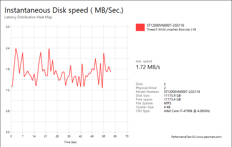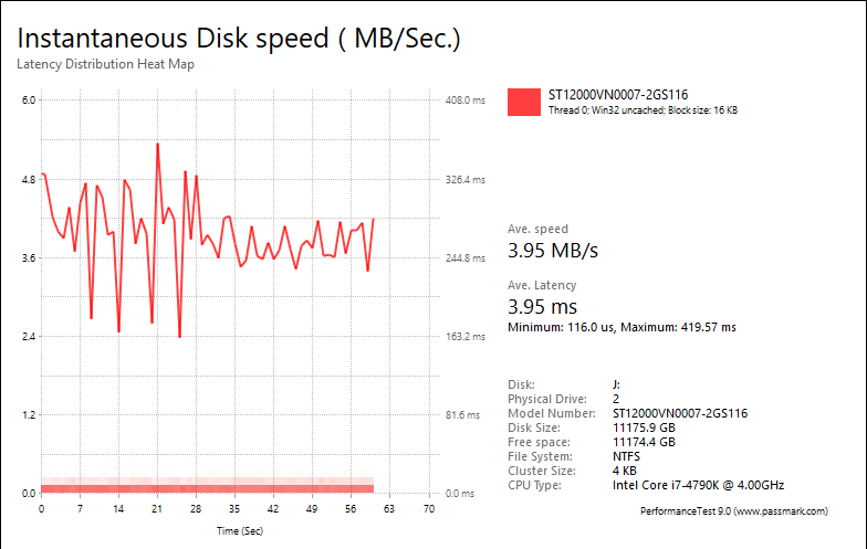 Overall, the Seagate IronWolf ST12000VN0007's performance was very good compared against other hard drives. With results of 1.72MB/s, 7.94MB/s, 13.09MB/s, 3.95MB/s, these are the second best numbers I have ever seen here at APH Networks for a mechanical hard drive. The fastest drive in this test is the Seagate BarraCuda Pro ST12000DM0007 12TB at 1.72MB/s, 8.18MB/s, 13.44MB/s, 3.96MB/s, respectively. Meanwhile, Seagate's IronWolf Pro 12TB came in at 1.63MB/s, 7.61MB/s, 12.57MB/s, 3.77MB/s, respectively. On the Western Digital side of things, the Red Pro WD6001FFWX posted numbers of 1.24MB/s, 8.91MB/s, 9.88MB/s, and 3.36MB/s, in that order. The IronWolf Pro 12TB was slower than the IronWolf we are testing today in performance, which, again, was surprising to me, considering I expected the Pro to deliver higher scores than the vanilla version.