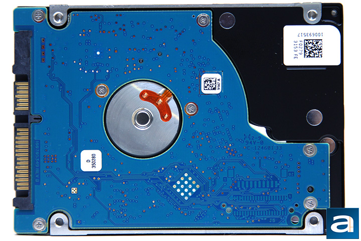 Turning the Seagate Laptop SSHD ST500LM000 500GB around, and you will see a blue printed circuit board that interfaces between its SATA 6Gb/s interface and the physical mechanical components. It also contains the flash components, in which we will look at in just a moment. Mechanically, the Seagate Laptop SSHD ST500LM000 500GB is a 5,400RPM drive with a single 500GB platter. You will see 465GB in Windows. Its areal density is as high as it can get, and all third generation laptop SSHDs from Seagate spin at 5,400RPM -- there are no more 7,200RPM mobile drives from the company since the inception of this product two years ago. The rated power consumption is 2.5W under load and 0.9W idling, which is pretty competitive.