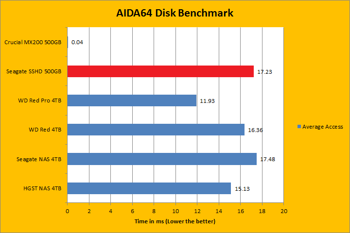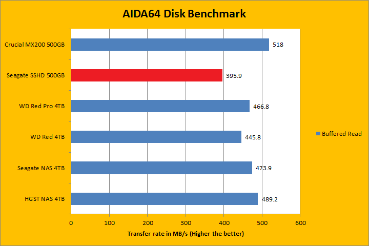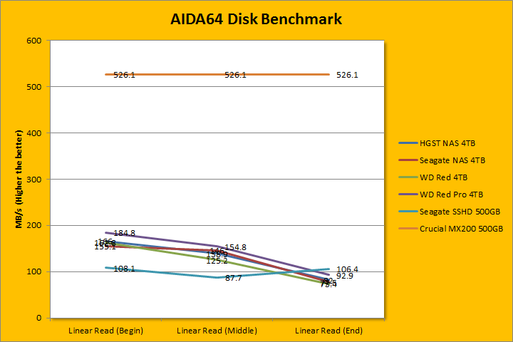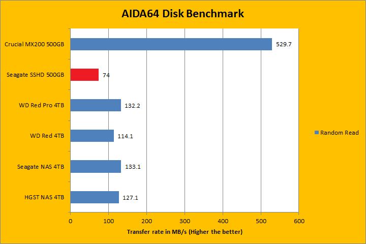 Since our storage review benchmark results are presented in alphabetical order, first up on the list are results from one of our favorite benchmarking programs, AIDA64 Engineer. Just to note, AIDA64 Engineer is a full synthetic benchmark. Unlike full synthetic motor oil, this usually does not always carry a good connotation. While it is not a representation of real life performance (Such as how fast Photoshop opens), it does provide valuable insight into performance between different drives and different controllers, especially since we have a bunch of hard drives and one SSD to compare against our hybrid drive today. As you can see in our graphs above, the Seagate Laptop SSHD ST500LM000 500GB had a pretty interesting performance signature. I did multiple runs on this drive, and it did not make a difference, so I kept them as one set of results. In the Linear Read section, the Laptop SSHD started off at 108.1MB/s, dropped to 87.7MB/s in the middle, and went back up to 106.4MB/s in the end. At first, I was a bit perplexed as to why the end of the drive would be faster than the middle, but HD Tach and HD Tune's performance graphs will show us why later on in this review. For the rest of the charts, the 5,400RPM ST500LM000 is much closer to being an HDD than SSD without caching, as expected.