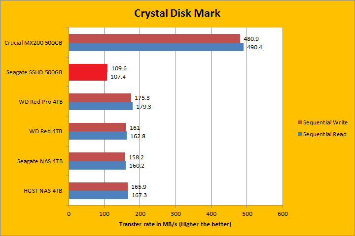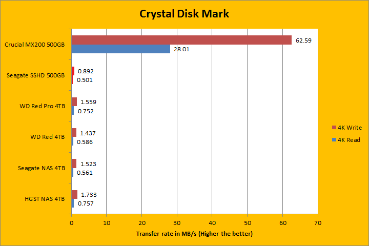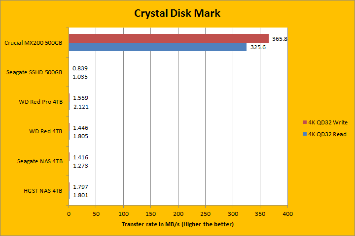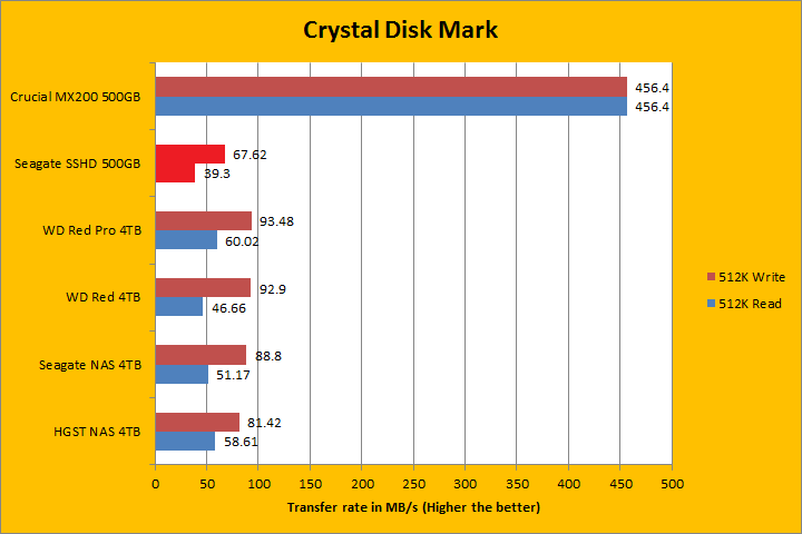 Crystal Disk Mark 3.0 is in the spotlight. Crystal Disk Mark is an important benchmark, because it tests the input/output operations per second capability of the storage device. As you can see in our charts above, compared against a few select drives; namely, hard drives from HGST, Seagate, and Western Digital, along with a mainstream MX200 500GB SSD from Crucial, the 5,400RPM Seagate Laptop SSHD ST500LM000 500GB was quite in line with my expectations. Crystal Disk Mark does not account for caching, so it was obviously no contest against the Crucial SSD. For a drive of this caliber, these results were what I was anticipating in the sequential read and 512K read sections. Like all HDDs in the presence of an SSD, it was blown away in the 4K and 4K QD32 results. I will let you take a look at the results in our comparison graphs above.