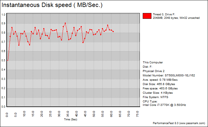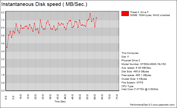PassMark PerformanceTest 8.0's Advanced Disk Test, unlike HD Tune Pro 4.60, generates some awesome graphs right out of the box. It also provides valuable insight in simulating real world performance applications. To make things clear to you, the first graph simulates a database server, followed by a file server, web server, and workstation. Drives with high sequential read and write performance will do well in PassMark PerformanceTest 8.0. However, it also requires high IOPS capabilities for the best score, and as such, results for hard disk drives will prove to be very relevant.