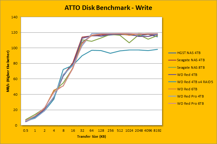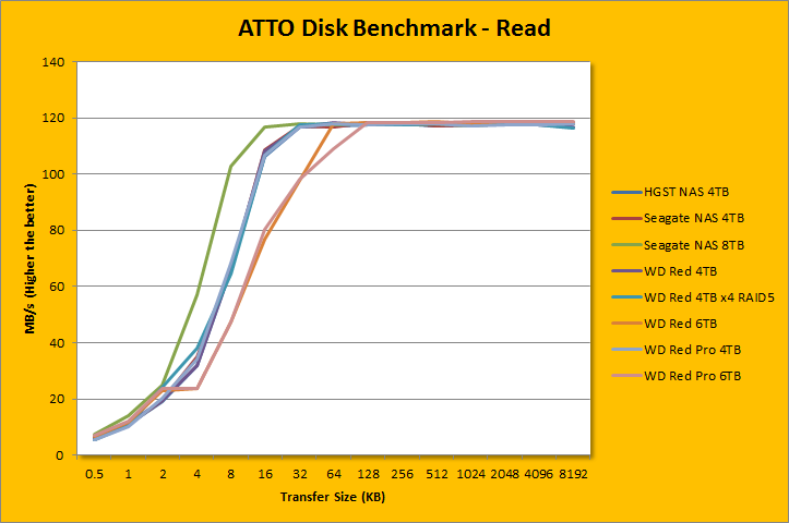 In the read test, all drives in single mode came out to be extremely close to each other, with the Seagate NAS HDD ST8000VN0002 8TB came it a hair behind the WD Red Pro 6TB yet again at 111.03MB/s. With that in mind, let us see how it performs across the curve in our remote ATTO benchmarks.