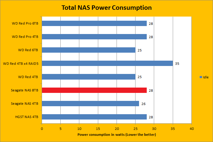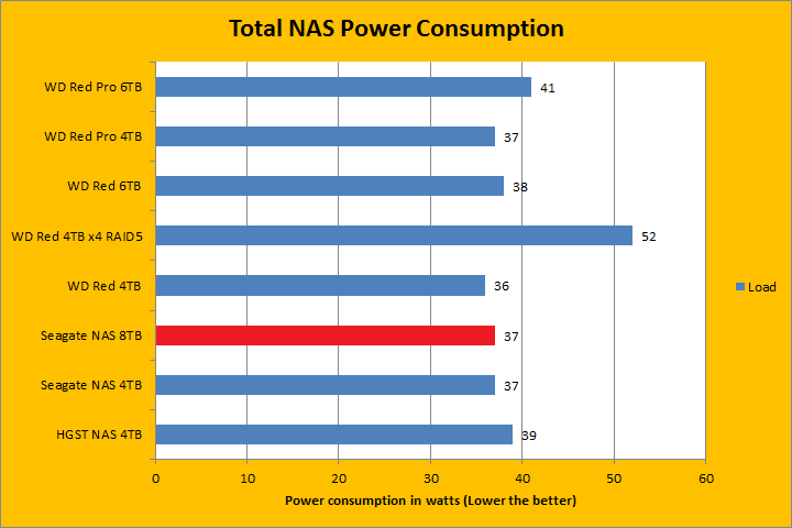 With four WD40EFRX installed, you can really see how it all adds up. While idling, the system took 35W; loading it up boosted this figure to 52W. How will this compare if we were to have four NAS HDD ST8000VN0002 8TB disks? To extrapolate the graphs a bit, this means running quad NAS HDD 8TB drives concurrently will probably take 47W idle and 56W load at my guess. The Seagate NAS HDD 8TB, a fast enterprise-based drive, will run you a few bucks more per month on your power bill. That said, while it did not consume the least power at idle, its load efficiency was surprisingly good.