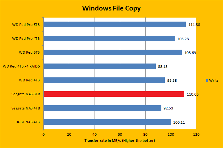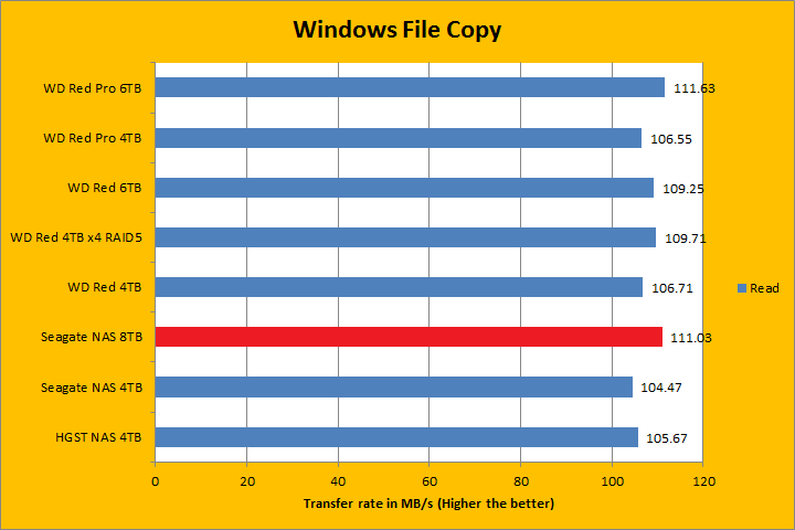Loaded with different hard disk drives, our QNAP TS-470 was ready to roll. According to the engineers at QNAP, and proven to be true in our performance benchmarks, Intel Gigabit LAN adapters -- at least on the client side -- traditionally performs better than their Realtek and Marvell counterparts. Therefore, to prevent any bottlenecks on the client side, our Gigabyte GA-Z97X-UD3H-BK motherboard was connected to the network via its integrated Intel Gigabit LAN adapter. We also conducted the above test on our OCZ Vector 180 240GB solid state drive on the client side to ensure there was nothing limiting the performance of our QNAP TS-470 than the NAS itself. In the write test, the NAS HDD ST8000VN0002 came in a hair behind at the Red Pro 6TB at 110.66MB/s, versus the Western Digital's 111.88MB/s score.