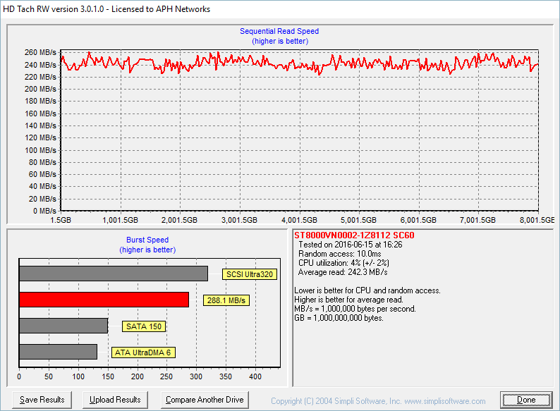 Now, it is the time for good old HD Tach. While HD Tach is more of a 'drag race' than a clear indication of real life performance, and has been around for a really long time, it is an excellent storage performance reference between hard drives for more than the last decade. Back in the days, if your average speed exceeded 60MB/s, you have a seriously fast drive. Where does the Seagate NAS HDD ST8000VN0002 8TB come in? With an average read speed of 242.3MB/s, and tested random access time of 10.0ms, this is mind-blowingly fast for a mechanical hard drive. But how does it compare against the other products? Seagate's own Enterprise Capacity 3.5 HDD V.5 8TB came in at 240.6MB/s with 8.4ms access time. For the Western Digital 6TB drives, the Red Pro WD6001FFWX clocked in at 227.6MB/s, and the Black WD6001FZWX pulled 217.8MB/s in the same test. The Seagate ST8000VN0002 8TB. along with the ST8000NM0055 8TB, are both by far the fastest mechanical hard drive ever tested in HD Tach here at APH Networks, but the 8TB NAS HDD's enterprise counterpart has a considerably better random access time.