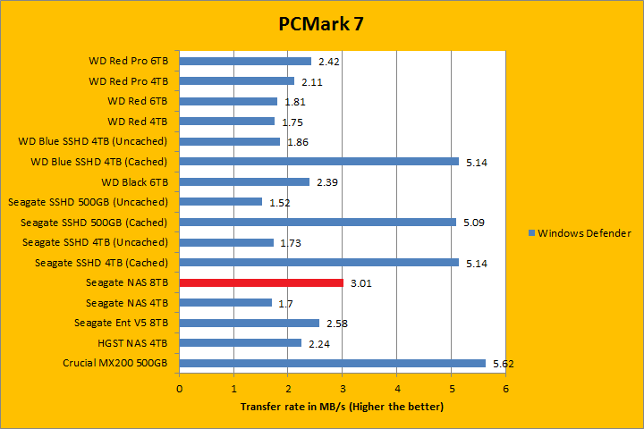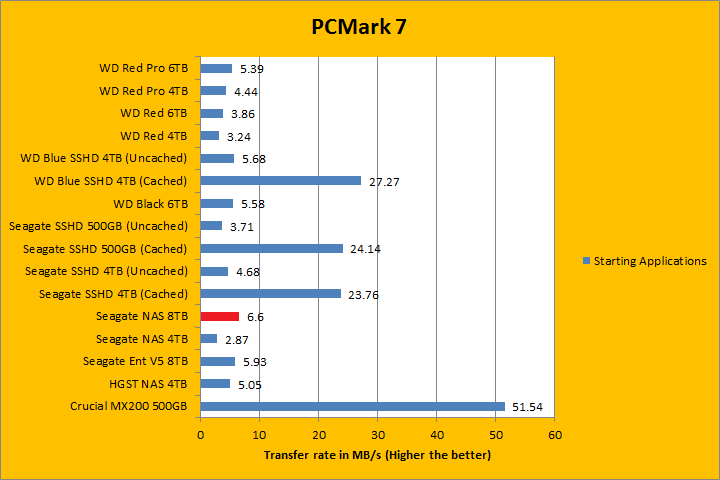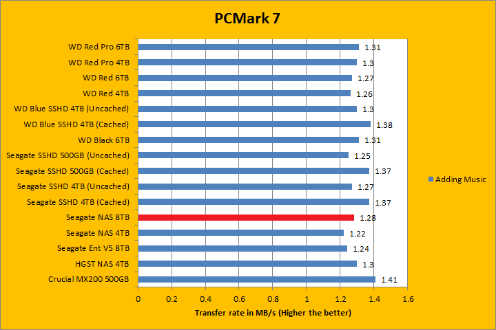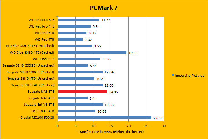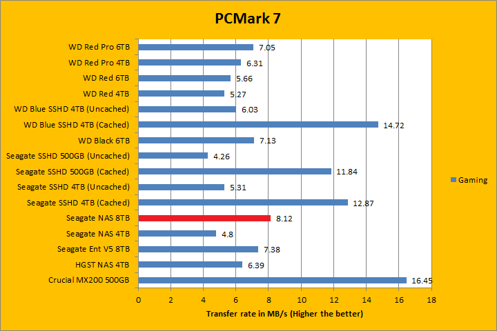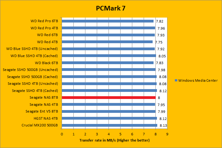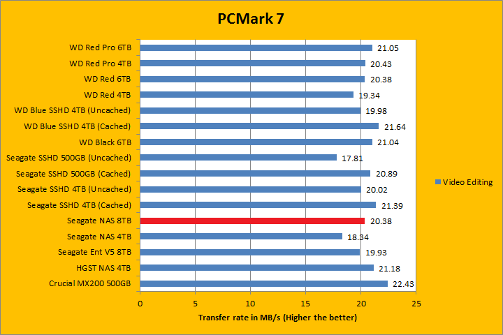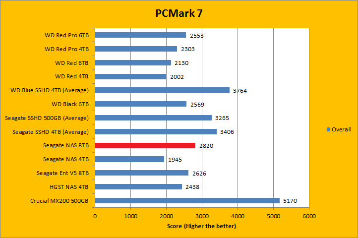 PCMark 7 aims to shed a little more insight into real life performance of your computer hardware by semi-synthetic means -- and all insight is good, right? The great thing about standardized tests is anyone can repeat them and get very similar results, given identical hardware. PCMark 7 is a Windows desktop environment based test, which is exactly what we are after. Also, we can see some caching going on between iterations, which allowed us to see what kind of boost some of the SSHDs in this test brings to the table. Well, I am not going to narrate the stuff above in detail, because we all know graphs are there for a very good reason. As you can see in our results above, the ST8000VN0002 was clearly the fastest pure mechanical hard drive in the overall score; besting its enterprise counterpart by almost 200 points. It consistently held its own or was among the top against other hard drives in each simulation segment, which was very impressive. In fact, the Seagate NAS HDD 8TB was behind the WD Red Pro 6TB in the Video Editing and Adding Music benchmarks only.
