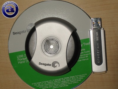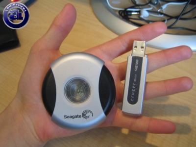 A quick size comparison between a CD, Sandisk Cruzer Mini 512MB and Seagate 5GB Pocket HDD. Due to the fact that the Seagate Pocket HDD is a hard drive, there's no way it can match the physical size of a flash drive. Amount of capacity that it offers seems like a good way of compensation, and it's not that big when compared to a CD. Like I said before, it's around the size of a small hockey puck.