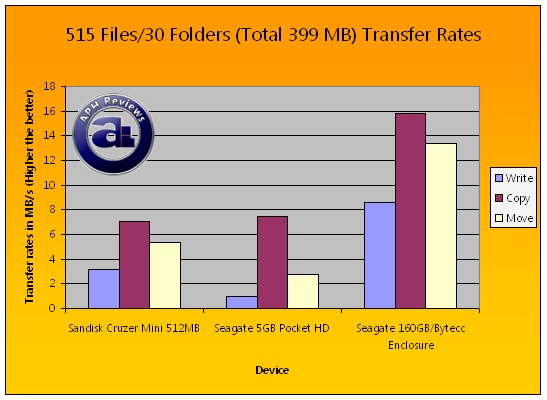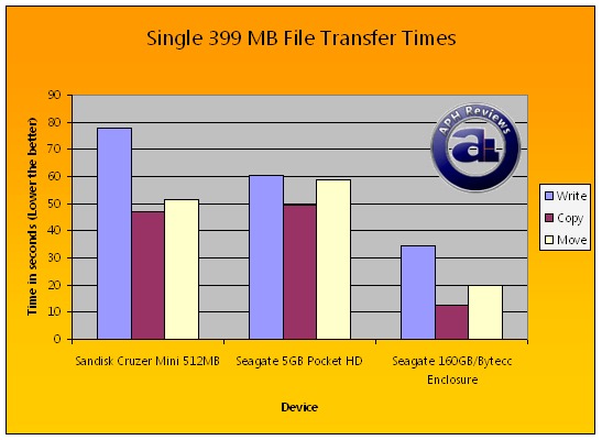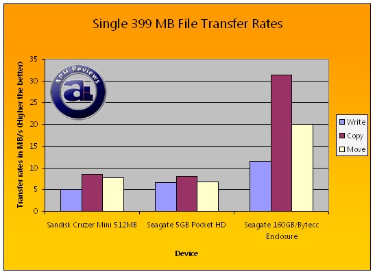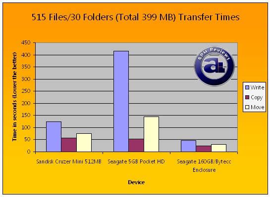 In our single file tests, it's no surprise that the Bytecc enclosure with a Seagate 160GB 7200RPM hard drive is by far the fastest. However, the Seagate 5GB Pocket HDD's performance is very close to the Cruzer Mini. In fact, the 3600RPM Seagate actually jumped in front of the Cruzer Mini on the write test -- completing the task in 60.27 seconds; chomping down the 399 MB file off at 6.62 MB/s while the Cruzer Mini finished copying in 77.92 seconds (5.12 MB/s). The copy and move tests results for these two devices are pretty close as well. The Pocket HDD copied at 8.07 MB/s and moved our test file at 6.77 MB/s, when compared to the Cruzer Mini's copy transfer rate of 8.47 MB/s and moved our test file at 7.74 MB/s. Remember, the Cruzer Mini is a flash drive with no moving parts while the Seagate 5GB Pocket HDD spins at only 3600RPM with 2MB cache. If you wonder about the external hard drive enclosure with an 160GB 7200RPM drive, it wrote at 11.54 MB/s, copied at a very impressive 31.42 MB/s and moved the 399 MB file at 20.07 MB/s.