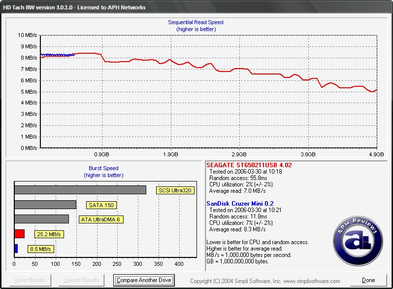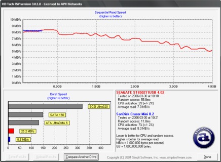 In HDTach, the Seagate 5GB Pocket HDD has much higher burst speeds, but the Cruzer Mini has a much more consistent sequential read speed. The pocket HDD's random access time according to HDTach is 55.8ms while the Cruzer Mini achieved a fairly decent 11.8ms. You can view the rest of the results by clicking on the image above.