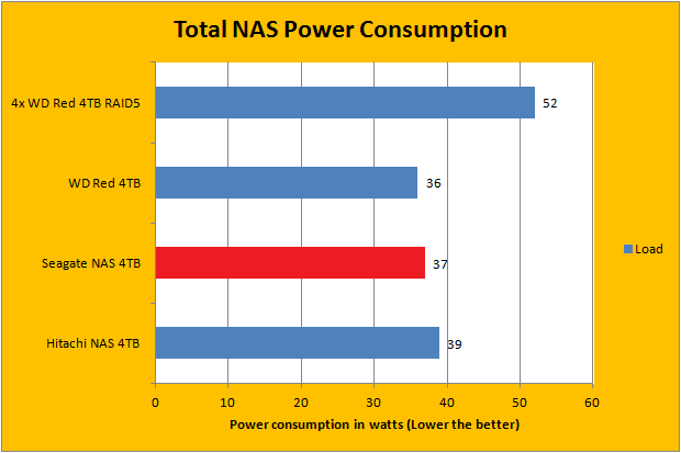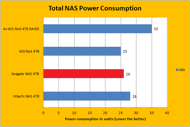 With one hard drive installed, our QNAP TS-470 consumed more power than the WD Red, but less than the HGST, with the Seagate NAS HDD ST4000VN000 4TB installed. Consider most network attached storage systems will be running 24/7, and there will more than likely be multiple hard drives installed, every watt will definitely add up on your power bill. When idling, the entire system equipped with the WD Red took only 25W, whereas the same system configured with the 5,900RPM Seagate NAS HDD took 26W -- just one more watt than the Western Digital Red. The same difference between the Seagate, Hitachi, and Western Digital can be seen in the load tests. With four WD40EFRX installed, you can really see how it all adds up. While idling, the system took 35W; loading it up boosted this figure to 52W. How will this compare if we were to have four Seagate NAS HDD 4TB drives? To extrapolate the graphs a bit, this means running four Seagate NAS drives will probably take 39W idle and 56W load at my guess. The NAS HDD, being the most value oriented drive of the group, consumes a little more than the Red, but is going to make barely any difference on your power bill. If we are talking purely economics, the initial cost savings will be justified.