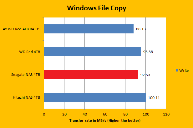 ATTO disk benchmark provides valuable insight into evaluating disk performance; it is especially valuable since it is not local disk limited like Windows file copy -- but rather the network adapter itself. After first using it in our QNAP TS-559 Pro+ review back in 2010, ATTO has been an integral part of our storage benchmarks; used in everything ranging from USB flash drives to solid state disks. Venturing in the area of 117MB/s in read and write for pretty much everything 32K and up, remember that the theoretical maximum of Gigabit Ethernet is 'only' 125MB/s (1000Mbps / 8) with overhead -- this is downright impressive. Interestingly, all three hard drives had almost identical performance curves when deployed, unlike what we have seen on Page 4 of this review. With four Western Digital Red WD40EFRX 4TB hard drives running in RAID 5, there was a speed penalty at 32K and above, as expected. Again, I would assume a similar performance drop if four Seagate NAS HDD ST4000VN000 4TB hard drives were configured the same way.