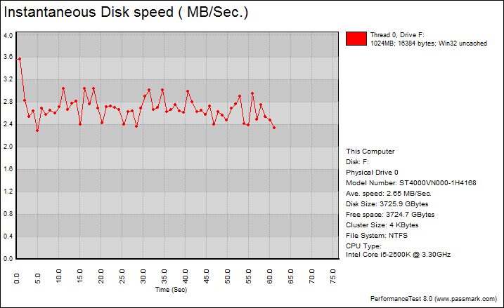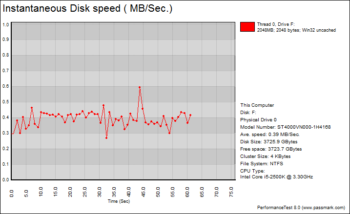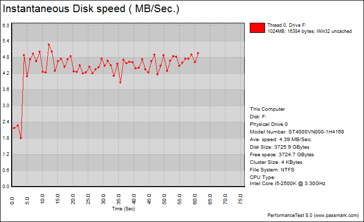 PassMark PerformanceTest 8.0's Advanced Disk Test, unlike HD Tune Pro 4.60, generates some awesome graphs right out of the box. It also provides valuable insight in simulating real world performance applications. To make things clear to you, the first graph simulates a database server, followed by a file server, web server, and workstation. Drives with high sequential read and write performance will do well in PassMark PerformanceTest 8.0. However, it also requires high IOPS capabilities for the best score, and as such, results for these NAS oriented hard disk drives will prove to be very relevant. In the first test simulating a database server, the Seagate NAS HDD ST4000VN000 4TB took last place at 0.39MB/s average, compared to 0.80MB/s for the Western Digital and 0.71MB/s for the HGST. The same deal goes for the file server performance simulation. The WD Red took the lead at 5.78MB/s, Hitachi second at 4.55MB/s, and Seagate third at 3.95MB/s. In fact, the WD40EFRX continues to take the crown as we move on to the web server simulation -- coming in at 7.47MB/s; compared to 6.98MB/s for the Deskstar NAS and 4.39MB/s for the ST4000VN000. Is there a test in PassMark PerformanceTest 8.0 that the Seagate NAS HDD outperformed another drive? Well, it will have to be the workstation test -- where it sneaked by the Western Digital's score of 2.61MB/s at 2.65MB/s, but still trailed the HGST at 3.06MB/s. As you can see, these server simulation tests are certainly not the NAS HDD's strong suite.