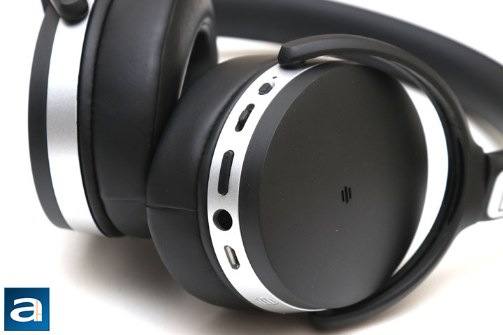 As for the controls of the Sennheiser HD 4.50 BTNC, all of the actions and functions are located on the right earcup. Starting at the top, we have a multicolor LED light to indicate power status, as well as for other status information like when charging or pairing. The next button is the power button. The next button is a multifunction slider button. When listening to music, it can be used to Play/Pause when pressed, or moved forward or back to go the Next or Previous track. On the other hand, it has even more functions when used in various calling scenarios, such as accepting and ending a call. The next bar is the Volume Up and Down keys, with the Volume Up being marked with a notch. A circular hole is next to the volume bar to allow users to plug the included cable to activate wired mode. The cable is proprietary in the sense it uses a less common 2.5mm sized plug, while also having a locking mechanism on the cable itself. Finally, at the bottom we have a micro USB input for charging the HD 4.50 BTNC.