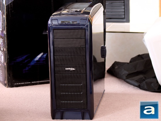 Before I had finished putting the Sentey Arvina GS-6400B down on the ground, I am already become impressed by its looks. A crisp sharp look with smooth edges and brilliant metallic surface is an enticing sight. The dark blue color is very well thought out; as it is subtle, yet provides a strong accent to the chassis. The Sentey logo is very nicely placed in the front -- large enough to display the logo, but small enough so it isn't overwhelming dominant at the same time. Initial impressions are good, but my only complaint is the cover on the side panel vents. It just looks a bit glaring, since it extends off of the case by a significant amount. It is nothing to worry about from a practical point-of-view; however, from a visual perspective it just seems to take away more than it adds to the look and feel of the case. The case's material is 1 mm thick SECC metal for the main panels, with some dark blue plastic to give it the desired shape. For those that don't know, SECC is an industry standard for computer chassis material, given its excellent properties and strengths it is certainly expected for any good quality non-aluminum chassis. The hard plastic, on the other hand, feels a bit cheap and flimsy.