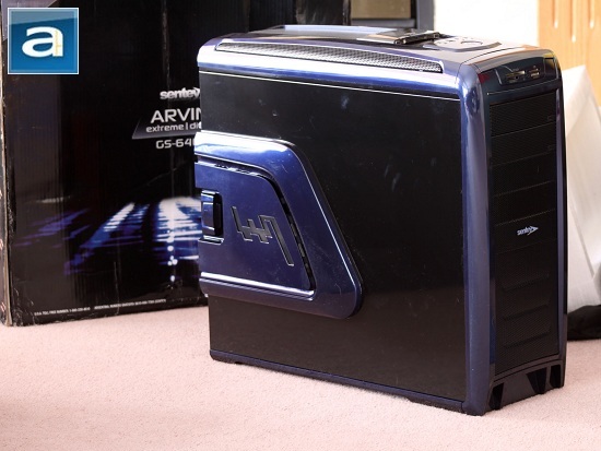 Lift the Sentey Arvina GS-6400B back up, and you will see the side. As I commented earlier, the side panel has a large cover over the vent. I feel this is a bit large, but it would definitely reduce the noise of the side exhaust fans and reduce the amount of entry points for dust into the system. Both side panels come off easily with two thumbscrews each. The thumbscrews effortlessly twist in and out of the side panels, which excellent for anyone who wants easy access into their computer. The Arvina GS-6400B case also has a small latch on the side to keep the cover from falling off after removing the thumb screws, and makes removal of the side panels simple. This is a well thought-out design and I'm pleased by how easy it is to remove the side panels of the case. Now with the side panel off, let's take a look inside!