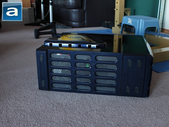 Flipping over the case to see the bottom, your eyes will naturally drift to all the air vents along the bottom. Fifteen in total if you feel like counting; all of them are covered with a dust filter on the inside. A unique feature here is that they provide mounting of a 120mm or 140mm fan on the inside, so you can actually utilize these extra air vents for more airflow inside the Arvina. The bottom of the case also has six rubber feet, with two located at the back, and four located up front. This is a great way to reduce the vibration from the case, and evenly distribute the weight of your hard drives and optical drives over four rubber feet at the front.
