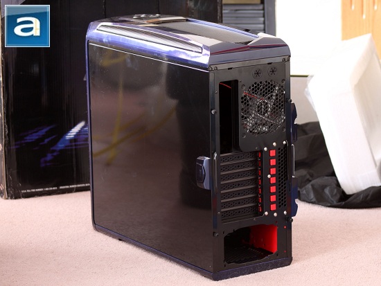 The first then you will notice about the back are the red tabs on the expansion card slots. Why they are red in a blue case is a good question. In my opinion, they should be blue to match the case, and not red to match different variants of the Sentey Arvina GS-6400. Although the benefits of this design choice are clear from a manufacturing point of view -- not to mention some may argue it actually delivers a good sense of contrast to the product. Only one re-attachable expansion slot cover is provided, while the rest of them are not re-attachable. This is quite disappointing for something of this price range. Fortunately, not many people will look at the holes at the back in the event that you do swap expansion card locations. In our photo above, you can see the opening for the power supply located nicely below the expansion slot array. The motherboard I/O location is standard next to the 120mm exhaust fan. Above the exhaust fan are two rubber grommets for a water cooling system.