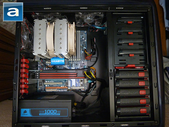 During my installation process, I popped off the side panel fans. This was a very quick process, as it comes off easily with only a little bit of force. The joint is designed so that under normal usage, it would stay in place, but if you ever need to take it off, it won't stand in your way. I particularly like this design here, as it a cleaner approach in providing additional airflow over the graphics card area. I have the tendency to install the motherboard last; in this case my Gigabyte GA-EX58-UD5 with my Intel Core i7-920. This is due to the fact I like to get everything lined up prior to putting it into the case. With my Noctua NH-D14 CPU heatsink, there isn't very much room to play around with cables once it has been put into the case. After routing the CPU power cable, two PCI-E power cables, and the 24-pin motherboard power cable through the back side of the case, I then put the CPU power cable through a conveniently located opening at the top back corner. Once this was plugged into the motherboard, it was time to line it up and screw it in.