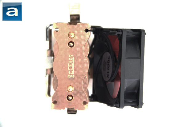 Since the 80mm fan comes pre-installed onto the SilenX Effizio EFZ-80HA3, it does not take much time to figure out which way the cooler should be installed. The single 80mm fan pushes air through the array of fins, just like most single fanned CPU cooler setups. Of course, one could very well use the provided rubber fan mounts to attach an additional 80mm fan for a push-pull configuration. The single fan provided uses a 3-pin motherboard connector. As shown in the picture above, the edges of each of the fins are cut in a wavy pattern, with the waved peaks alternating between each fin. Also, each fin incorporates little dots at the top. This design, added with the waved fin shape, increases the heat dissipation performance by optimizing the aerodynamics of the entire unit, thus decreasing turbulence noise.