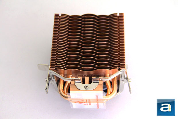 Using the above photo as a reference, we can see that the actual heatpipes on the unit runs across the contact plate base of the cooler. This direct heatpipe design is used to improve thermal transfer efficiency. The idea itself is pretty smart, as the contact base would not need to transfer heat onto the heatpipes by an additional step. Unfortunately, there is a problem with this design. Although the U-shaped copper heatpipes are flattened out at the base, there is still a minute gap between the copper heatpipe and the aluminum base. The small gaps that have no contact with the CPU will undoubtedly end up creating hotspots on the integrated heatspreader, and inevitably decrease the overall cooling performance of the unit. Theoretically, there should be better heat transfer due to the fact that the thermal conductivity of copper is higher than aluminum. For your reference, copper's thermal conductivity is 401 W/mK, as opposed to aluminum's 237 W/mK. Also, one last issue to note with this direct heatpipe contact base design is that the difference in material may degrade over time, due to different coefficients of thermal expansion in different metals.