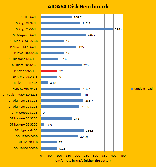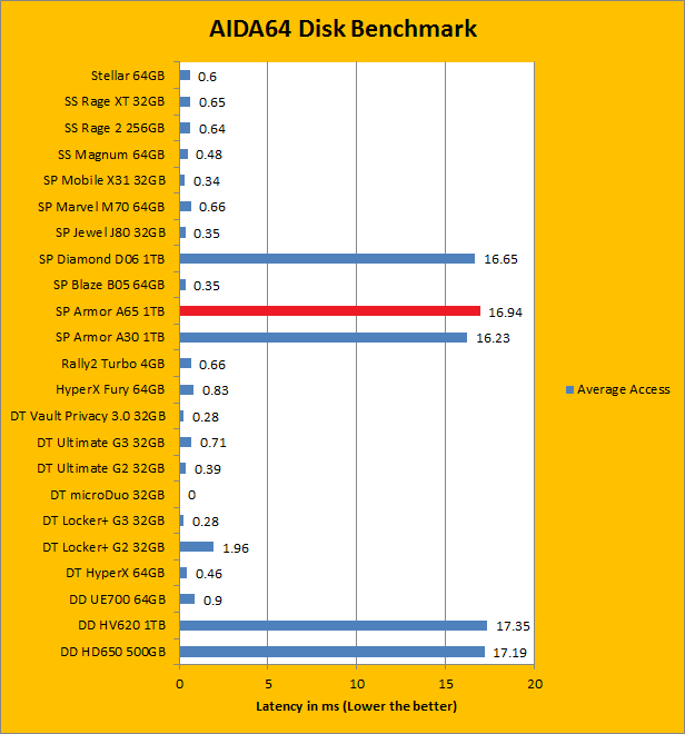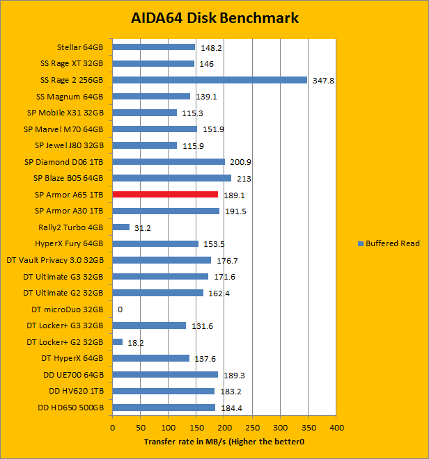As with all our portable disk reviews, I would just like to make it clear from the start that we are, by no means, expecting Silicon Power Armor A65 1TB to deliver performance competitive with the slew of flash based memory devices on the list. However, our AIDA64 results do provide interesting insight to the performance of the Silicon Power Armor A65 1TB as a USB 3.0 portable hard drive. Delivering up to 115.4MB/s sequential read, 92.0MB/s random read, and 189.1MB/s buffered read, it is actually pretty darn fast for it being an external 5400RPM 2.5" HDD. Compared to the Silicon Power Armor A30 1TB, Silicon Power Diamond D06 1TB, and ADATA DashDrive HV620 1TB, these results turned out to be extremely close. Its 16.65 ms random access time is what you would expect from a traditional mechanical disk as well. So far, for 1TB of USB 3.0 storage, they are exactly what I have been expecting.