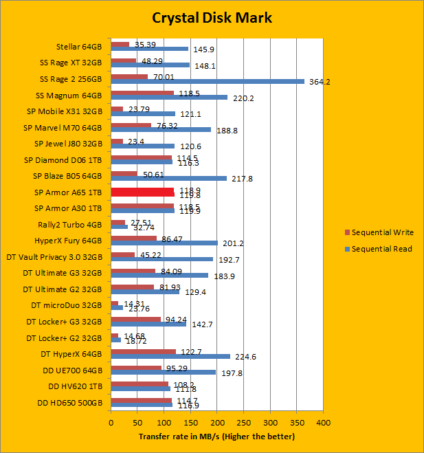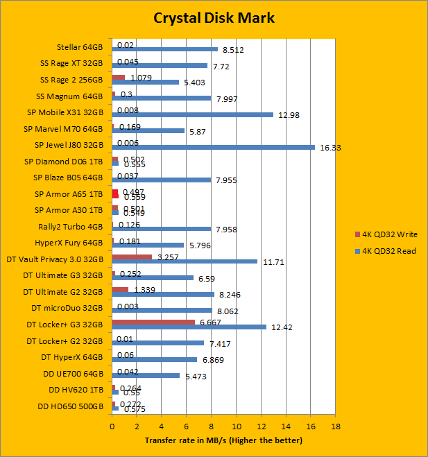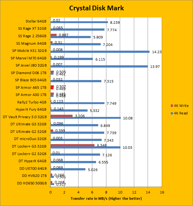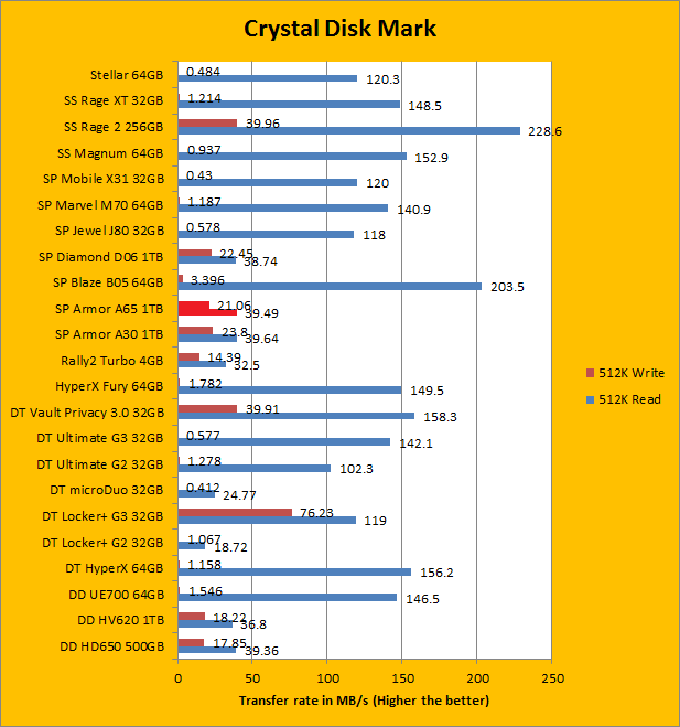 The Silicon Power Armor A65 1TB continued to perform well as we move into our Crystal Disk Mark sequential read and write results. Once again, it did not post big performance numbers in the sea of USB flash drives, but we never expected it to in the first place. In fact, these relatively modest results are very commendable, and they are exactly where we expect them to be against other 1TB USB 3.0 external hard drives of the same capacity. Its sequential read and write results generally reflect what we have seen in the past two pages; carrying the exact same performance profile as the Armor A30. Of course, the biggest surprise came in when we shift our focus to the 512K write results. Like other USB 3.0 hard drives we have reviewed in the past, it completely destroyed every USB 3.0 device on the list. As we move into the 4K and 4K QD32 territory, which requires high input/out operations per second (Commonly referred to as IOPS), the Silicon Power Armor A65 1TB continued to outperform all the other tested USB flash drives in the write portion, other than the Patriot Supersonic Rage 2 256GB. Traditionally, this has always been a weak point for USB flash drive. Of course, its read performance was handily outperformed by its smaller, non-mechanical counterparts, but this was to be expected.