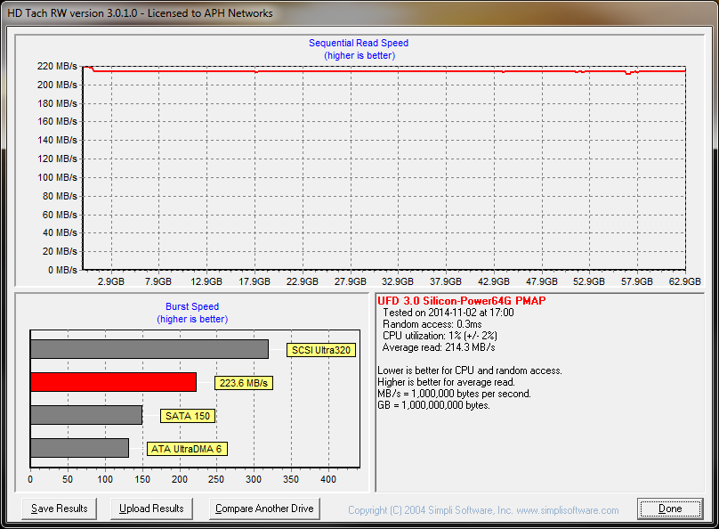 As mentioned in other storage reviews here at APH Networks, HD Tach takes a “drag-race” approach to evaluating drive performance, but it still provides valuable insight into how good a drive is compared to the next. As we can see from the screenshot above, the average read speed of the Silicon Power Blaze B05 64GB is 214.3MB/s. This is pretty impressive for a USB drive commanding $40 at press time. You can see an almost 100% flat line, as shown in the screenshot above. Similar to the Silicon Power M70, the drive came with files preloaded, but I took the liberty to remove those files. If they were still on the drive, the line would more closely resemble the line created by the M70. As well, the burst speed sits at 223.6MB/s, but this should make little difference in real life. The latency is 0.3ms, which is consistent with our AIDA64 results.