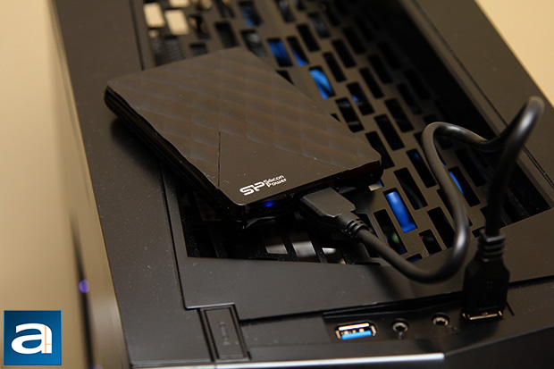At the bottom, you will find a USB 3.0 SuperSpeed connector. It is labeled by a "SS" designator next to a USB logo, just to make sure Hitler would not be confused if it was still 1939. Measuring in at 116mm deep, 78mm wide, and 13mm thick, the Silicon Power Diamond D06 1TB is pretty compact and slim. I do not exactly know how much the 1TB model we are reviewing today weighs, but the 500GB version is 138g, and the 2TB version is 174g. These figures are quite standard. Because the Diamond D06 has a 2.5" hard drive inside, and uses the USB 3.0 interface, the port already provides all the power it needs; no external AC adapter is required.