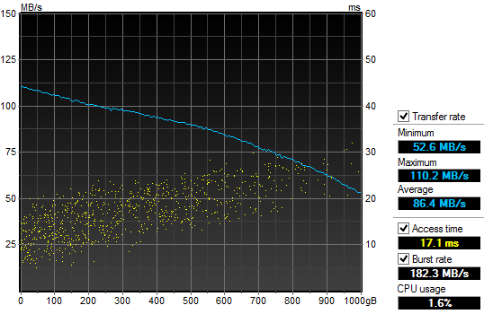 Unfortunately, HD Tune does not generate any fancy independent graph outputs in particular, so I had to edit my screenshot out a bit to make it look better for publishing in a review. Again, like our HD Tach results on the previous page, the line reflects that of a standard hard drive as before, just like how it is supposed to be. It differs slightly in magnitude than the other program -- probably due to testing algorithms used -- but its performance characteristics are identical in practice. The average works out to 86.4MB/s; with a peak of 110.2MB/s and minimum of 52.6MB/s. These figures are, once again, almost identical to the ADATA DashDrive HV620 1TB. The Silicon Power Diamond D06 1TB's tested latency is also consistent with what we have seen in AIDA64 and HD Tach.