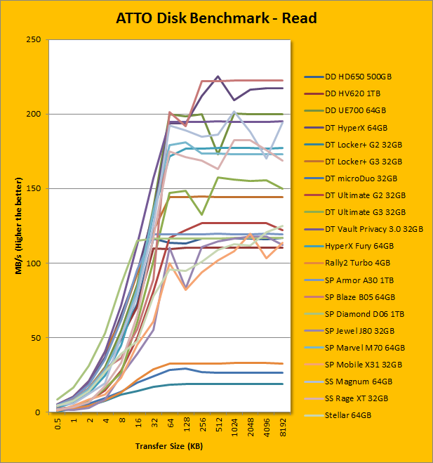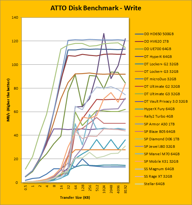 As you have read before, ATTO Disk Benchmark is one of our favorites in terms of testing anything from SSDs to network attached storage systems; this has seen its share of everything. So it is only naturally we throw the Silicon Power Jewel J80 32GB into the ring to see how it fares with this test. Looking at the write results, the Jewel J80 32GB actually surprises us with a peak performance of 71.487MB/s. While this does not sound like a large number, it handily beats out recent Silicon Power drives like the Blaze B05 64GB and the Marvel M70 64GB. Flipping to the read tests is a different story, however. While its peak read speed of 117.993MB/s is obviously higher than its write speed, it is quite a bit farther behind all of the other USB 3.0 drives we have received. Only the Mobile X31 is close to the Jewel J80, which is not too surprising considering what we have seen in the AIDA64 benchmark. While I do not expect the Silicon Power Jewel J80 32GB to be designed for speed, this kind of showing is disappointing.