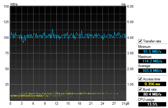 Unfortunately, HD Tune Pro does not generate fancy independent graphs, so we have to edit the screenshot of the benchmark, and edit it for publishing purposes. Once again, this graph follows a similar flat-line trend as we saw in the last test. The only differences will be the magnitude, and this comes as a result of different algorithms between the two test benchmarks. An average read speed of 103MB/s and a burst rate of 80.4MB/s is just another display of the Jewel J80's lower performance. The only other thing to note is the latency speed. From AIDA64, we had an access time of 0.35ms. HD Tach and HD Tune produced similar results of 0.4ms and 0.356ms. The higher HD Tach result is probably due to the imprecision and rounding of the numbers rather than an actual different result. Otherwise, the results speak for themselves.