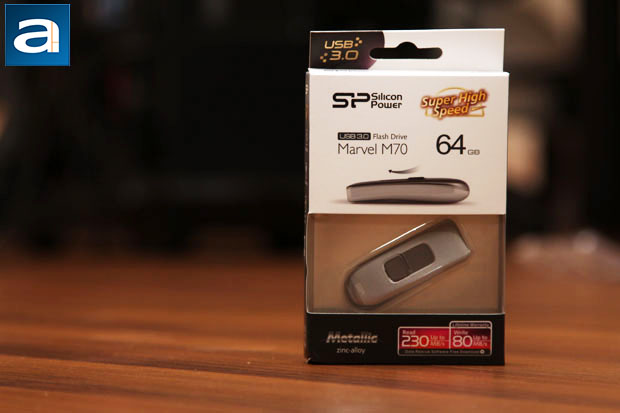 Taking the product out of its packaging, I found the Silicon Power Marvel M70 not in its typical polyvinyl chloride casing used by other competitors, but in a glazed cardboard case instead. The retail box is very minimalistic, and down to the basics. As you can see in our photo above, you can see Silicon Power's logo at the upper left hand corner, drive model name, capacity rating, and a picture of the side view of the product. A window shows off the drive physically. Additionally, it highlights its USB 3.0 interface, which is an upgrade from traditional USB 2.0 drives we use on a daily basis. Silicon Power advertises the drive to hit a whopping 230MB/s read and 80MB/s write; this is definitely something we will check out in this review.