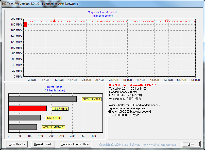As mentioned in other storage reviews here at APH Networks, HD Tach takes a “drag-race” approach to evaluating drive performance, but it still provides valuable insight into how good a drive is compared to the next. As we can see in the screenshot above, the average read speed of the Silicon Power Marvel M70 64GB is 189.1 MB/s. This rate is pretty good for a USB 3.0 flash drive and still, you can see almost a flat line except at the beginning, where it represents some files already on the drive that came from the factory. Compared against the ADATA DashDrive Elite UE700 64GB and Patriot Supersonic Rage XT 32GB, the results are very similar. The burst speed is indicated as 178.7 MB/s, but this should not make a difference in real life at all. The tested latency is 0.7ms, which is consistent with out AIDA64 results. Finally, we are on to our last benchmark, HD Tune Pro.