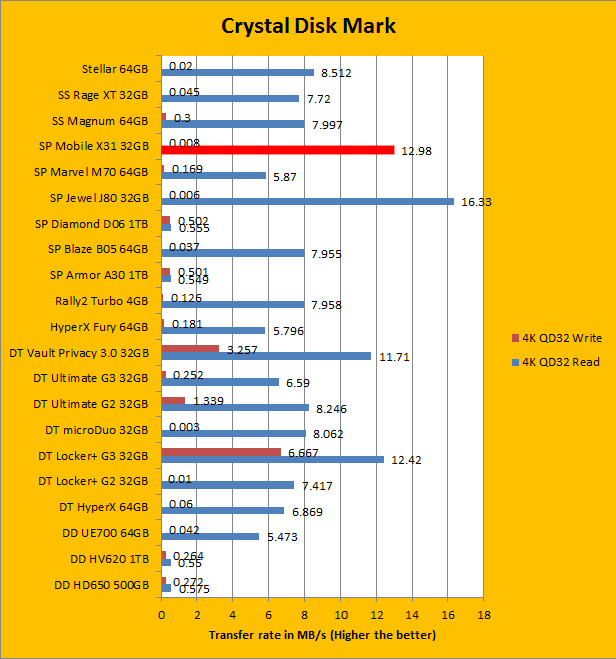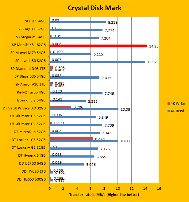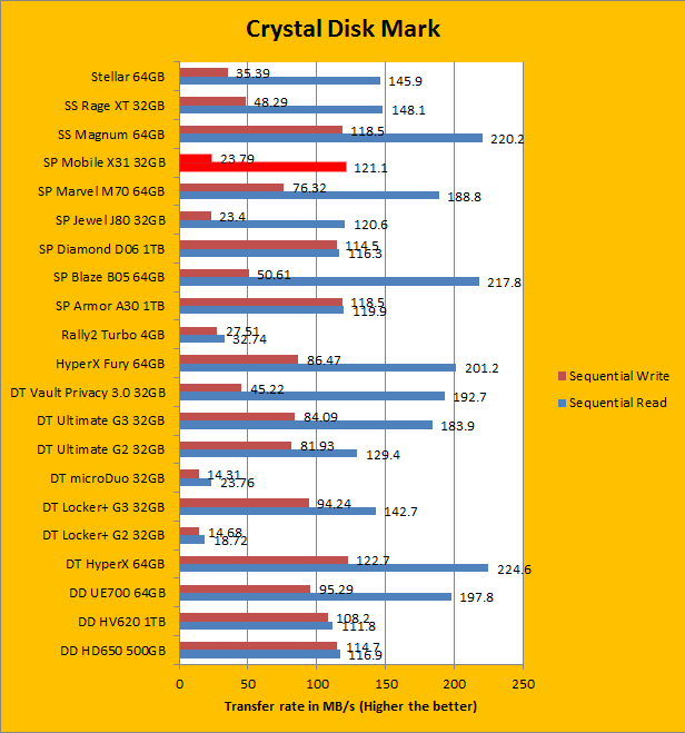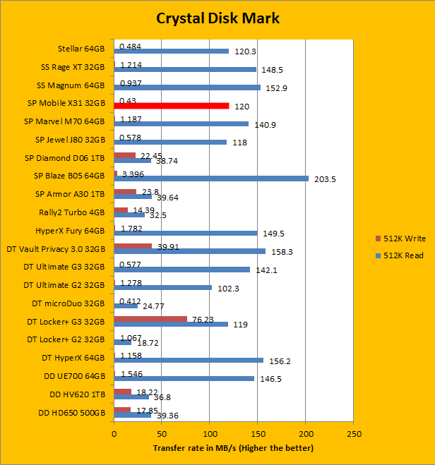 I may sound like a broken record at this point, but the results we obtain from the Crystal Disk Mark 3.0 reminds us of the similarities between the Silicon Power Jewel J80 32GB and the Silicon Power Mobile X31 32GB we are currently testing. The sequential write and read speeds are 23.79MB/s and 121.1MB/s respectively. This is quite comparable to the Jewel J80 32GB, but considerably slower than the Patriot Stellar 64GB. With regards to the 512K test, things become more comparable. However, the 4K and 4K QD32 showed completely different results. The 4K write speed was not surprising, but the 4K read speed was the highest across the board. Lastly, the 4K QD32 read test showed the Mobile X31 came second only to the Jewel J80 at a read speed of 12.98MB/s. The results are surprising, due to the first two tests within Crystal Disk Mark 3.0 showing nothing more than what we would expect for a drive of this size. The last two tests, on the other hand, showed superb read performance compared to the rest of the USB 3.0 flash drives.