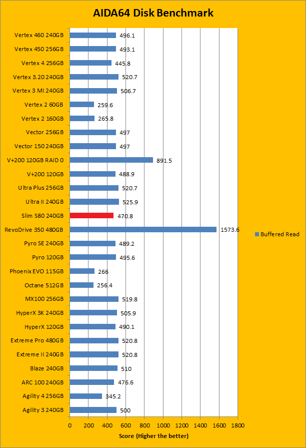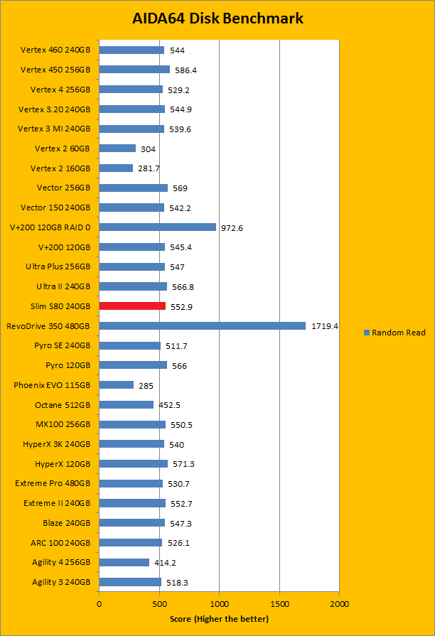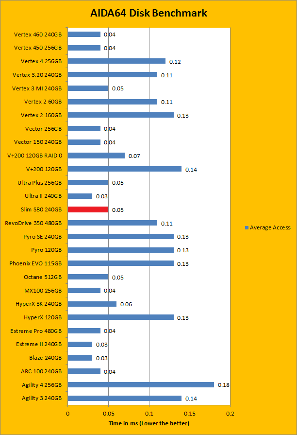 Since our SSD review benchmark results are presented in alphabetical order, first up on the list are results from one of our favorite benchmarking programs, AIDA64 Engineer. Just to note, AIDA64 Engineer is a full synthetic benchmark. Unlike full synthetic motor oil, this usually does not always carry a good connotation. While it is not a representation of real life performance (Such as how fast Photoshop opens), it does provide valuable insight into performance between different drives and different controllers. As you can see in our graphs above, the Silicon Power Slim S80 240GB was very similar to the Patriot Blaze 240GB, another Phison based drive. Compared to other value oriented drives in the category, including the Crucial MX100 256GB, OCZ ARC 100 240GB, and SanDisk Ultra II 240GB, the same goes. The tested random access time was 0.05ms, which is reasonable. The rest of the comparison results against all the other drives can be seen in our graphs above.