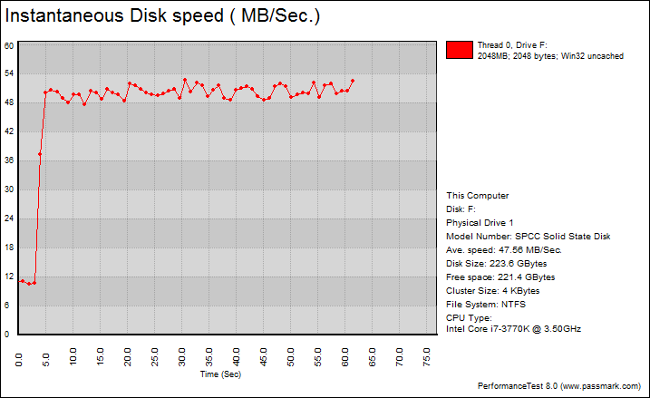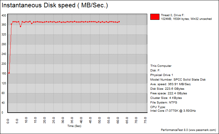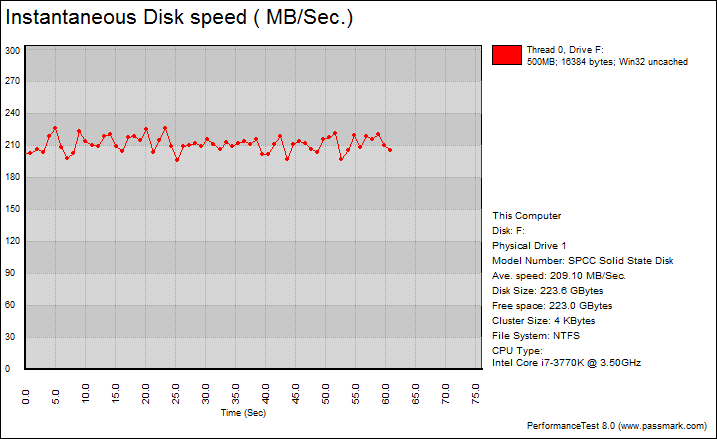 PassMark PerformanceTest 8.0's Advanced Disk Test, unlike HD Tune Pro 4.60, generates some awesome graphs right out of the box. It also provides valuable insight in simulating real world performance applications. To make things clear to you, the first graph simulates a database server, followed by a file server, web server, and workstation. Obviously, PassMark PerformanceTest 8.0 uses highly compressible data in most tests some controllers can really take advantage of. However, it also requires high IOPS capabilities for the best score. In the past, Marvell and Indilinx based drives perform pretty well in this test. One thing clear is the Silicon Power Slim S80 240GB provided incredibly flat graphs, which is excellent if you are looking for consistent performance.