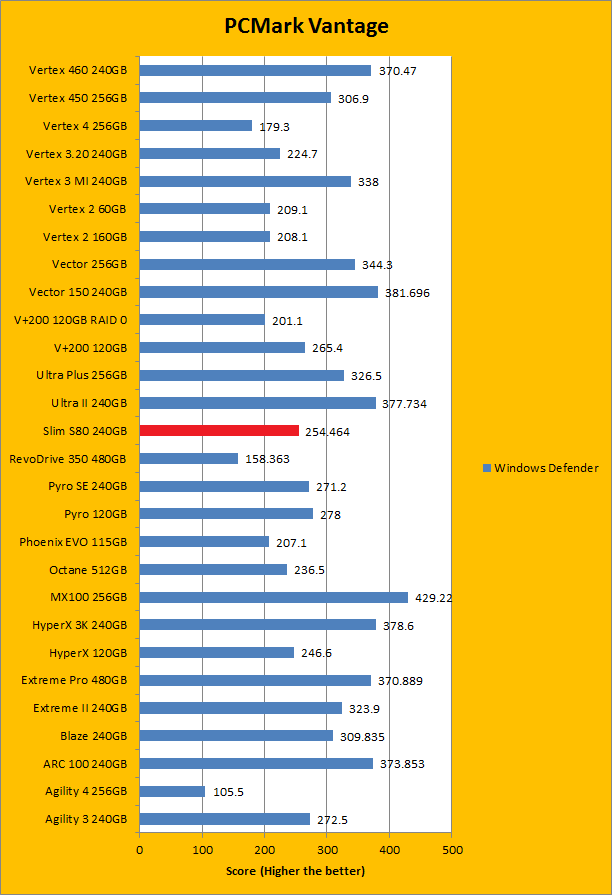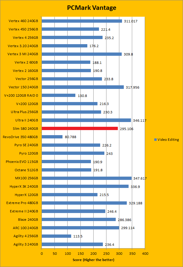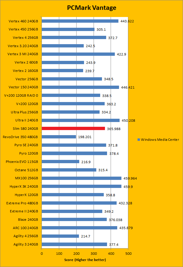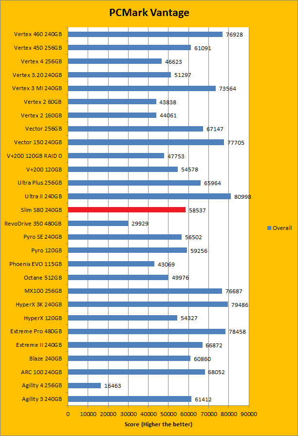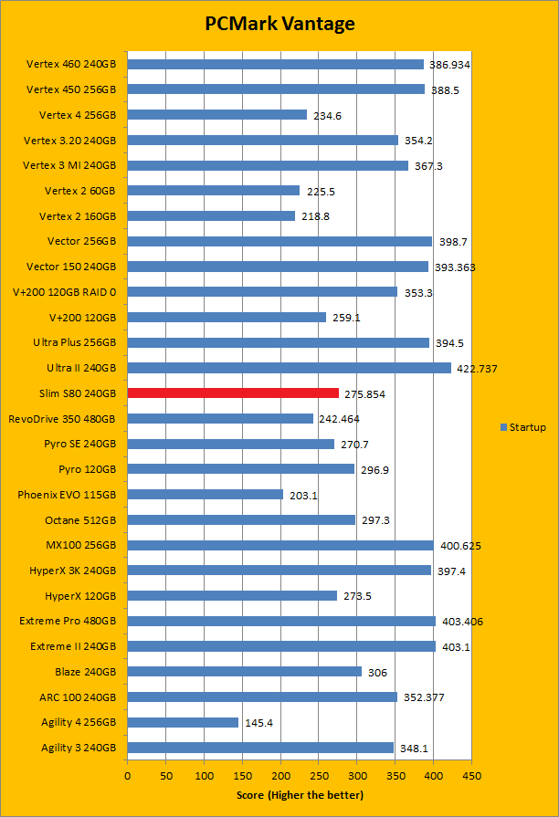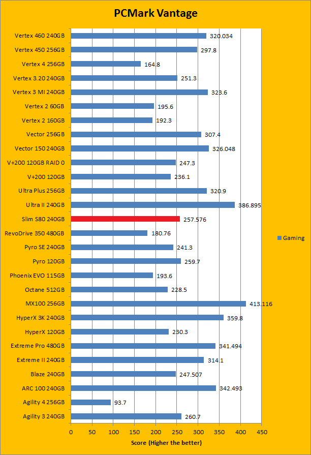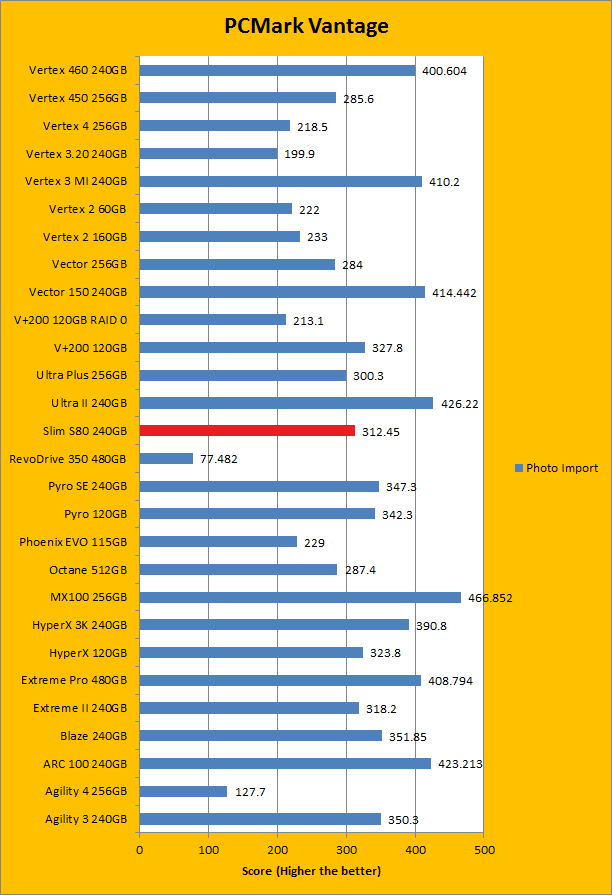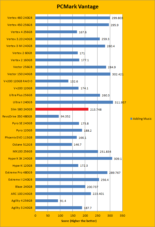 PCMark Vantage aims to shed a little more insight into real life performance of your computer hardware by semi-synthetic means -- and all insight is good, right? The great thing about standardized tests is anyone can repeat them and get very similar results, given identical hardware. Well, I am not going to narrate the stuff above in detail, because we all know graphs are there for a very good reason. Just to give you a bit of insight if you are too lazy to go through all nine comparisons, the Silicon Power Slim S80 240GB performed pretty mid-pack at best. PCMark Vantage uses some pretty simple simulations, so it is pretty optimized for single disks with relatively fast linear read (It does funny things when you got a RAID array though). The results were not bad, but compared to the modern low cost SSD, there are clearly better choices out there. Among the four we value drives we are zeroing in on today -- the OCZ ARC 100 240GB, Patriot Blaze 240GB, Crucial MX100 256GB, and SanDisk Ultra II 240GB -- the Silicon Power Slim S80 240GB was booted by every single one of them overall. In the subcategories, it was dead last in four out of eight tests by a very considerable margin; in the remaining four, it only posted better results than the Patriot Blaze 240GB featuring the same Phison controller; again trailing behind the rest of the competition by a very wide gap.