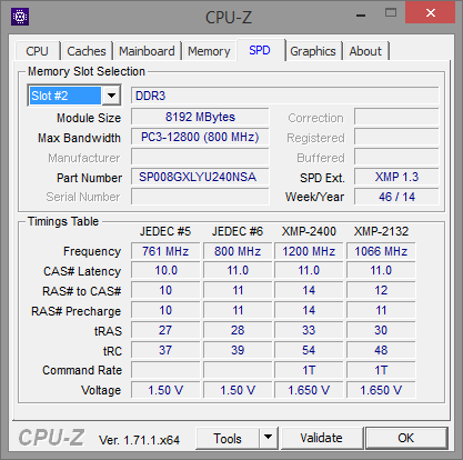 A screenshot of the memory tab in CPU-Z with Silicon Power's Xpower PC3-19200 2x8GB installed. The SPD timings table in CPU-Z reads standard JEDEC specifications programmed into the memory, as well as Intel XMP data for running the memory at various speeds. Using the latest BIOS revision, our motherboard used for testing had no issues detecting and working with the Silicon Power RAM right out of the box. It seems the XMP table is slightly different from the specifications at 11-13-13 from CPU-Z, but ran correctly regardless. The Silicon Power Xpower PC3-19200 2x8GB retails for approximately $140 at press time.