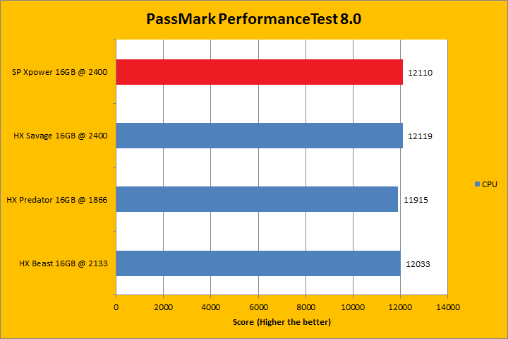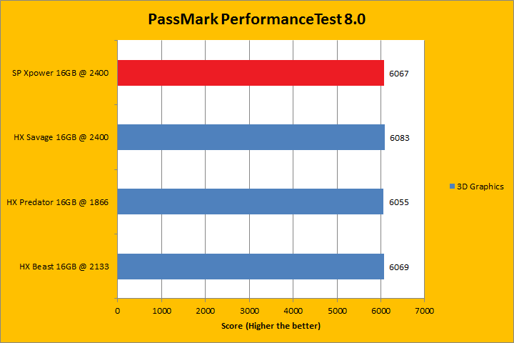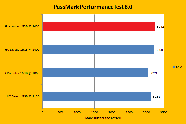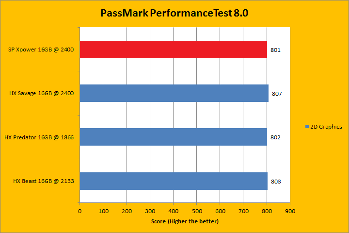 We run PassMark PerformanceTest 8.0 to evaluate four different areas of our system; coming down to the CPU, RAM, 2D Graphics, and 3D Graphics. It takes a somewhat different approach in obtaining results compared to other programs, which is why we like to use it, haha. PassMark Performance Test 8.0's memory benchmarking tool is the only test in our setup that takes memory capacity into account, but thankfully we are testing only 16GB kits today. Generally speaking, doubling the RAM will increase the score by about one and a half times. Again, all the results were extremely close to each other, with the high bandwidth Silicon Power Xpower PC3-19200 2x8GB kit taking home the lead by a minuscule margin in the RAM test, and holding its own in the rest.