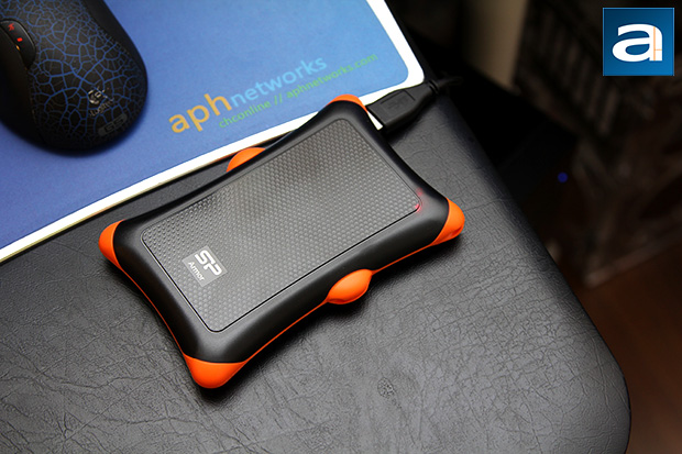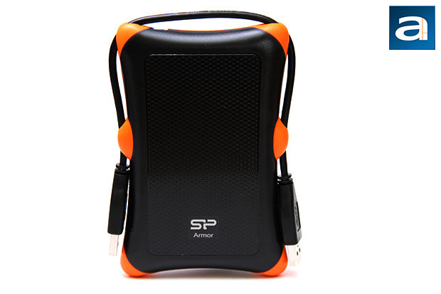 While ADATA chose a more conventional route with its brick-like shape with the DashDrive Durable HD650, Silicon Power has added more pronounced edges, both by design and by color. I have to say this is a very interesting device; unlike anything we have seen before. One of my friends even mentioned it resembled a teddy bear. As I pulled my face out of my palms, I had to admit that she was not too far off. You can almost see its closeness to a small stuffed animal... if you look really hard. One design choice I like is the inclusion of rubber slits on the top and side bumpers, which allow the cable to be held with the hard drive in one piece. This way, users would not have to worry about having the cable with them, since it will be attached. Securing it in place is also very simple and requires very little effort. On the plus side, it also forms a nice little handle with the cable, in case you want to go out in your neighborhood asking for candy on the aforementioned date. While you will get some strange stares as you carry your Silicon Power Armor A30 around, you can rest assure you will have your memory, all one terabyte of it, with you.