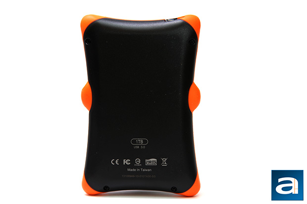 Taking the first glance at the Silicon Power Armor A30, and you will probably notice the colors the most. In fact, there are not many black and orange products out there, unless you decide to go shopping on the last day of the tenth month every year. On all of the corners and two of the sides are orange silicone bumpers sticking out to provide some color in an otherwise boring looking device. The rest of the front is a less spooky honeycomb-like pattern. This patterned area is resistant to scratches and scuffs, but unfortunately, this is only a section of the front. The rest is a more standard black plastic, which actually is not really protected at all. Aesthetically, this hard drive is different. For the most part though, the Armor A30 is quite fingerprint proof, holding onto very minimal stains from fingers and other liquids.