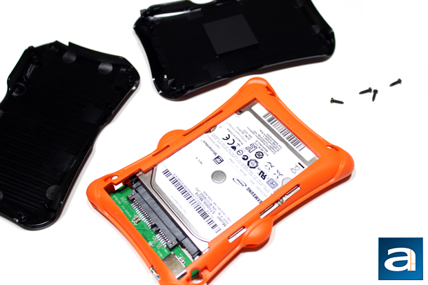 Popping the screws off one by one, the two plastic sides came off easily, revealing the orange internals. I guess those corners were more than skin deep, as the entire hard drive is actually sitting in the orange silicone. The top plastic piece also has a rubber square between the side and the hard drive to provide some shock absorption. Looking at the innards, we see this is a Seagate ST1000LM024 HN-M101MBB, but is also marketed as a Samsung Spinpoint M8, hence the Samsung branding. Inside is a 1TB 5400RPM SATA 3.0Gb/s laptop hard drive with 8MB cache. There are two platters inside, with 500GB per platter, making it quite dense. Also, if you look over at the ADATA DashDrive Durable HD650 500GB, you will notice these specifications are quite similar, besides the total capacity, thus making for a great speed race. As these reviews are being released one after the other, you will find both results on the next pages of graphs.