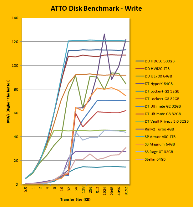 Our next benchmark is the ATTO read and write tests. ATTO benchmarks have become a standard, even a canon, across APH Networks for testing all types of storage performance, from network attached storage to flash drives. This is mainly due to its accuracy and thorough testing with varying transfer sizes. As you can see from the graphs, the Silicon Power Armor A30's read and write performance differs by about one megabyte per second at maximum speed, topping at 121.414MB/s and 119.57MB/s, respectively. Regarding the curves, the Armor A30 reaches optimal performance around 32K and above, much like the ADATA DashDrive Durable HD650 500GB. The Armor A30 is once again consistently better than the HD650 in this test by a hair. While these gains may not be noticeable by consumers, there is still a difference. Nonetheless, this performance is respectable, once again considering it is just a 2.5" hard drive inside.