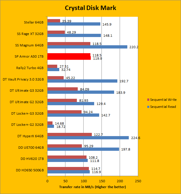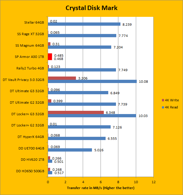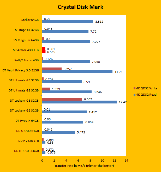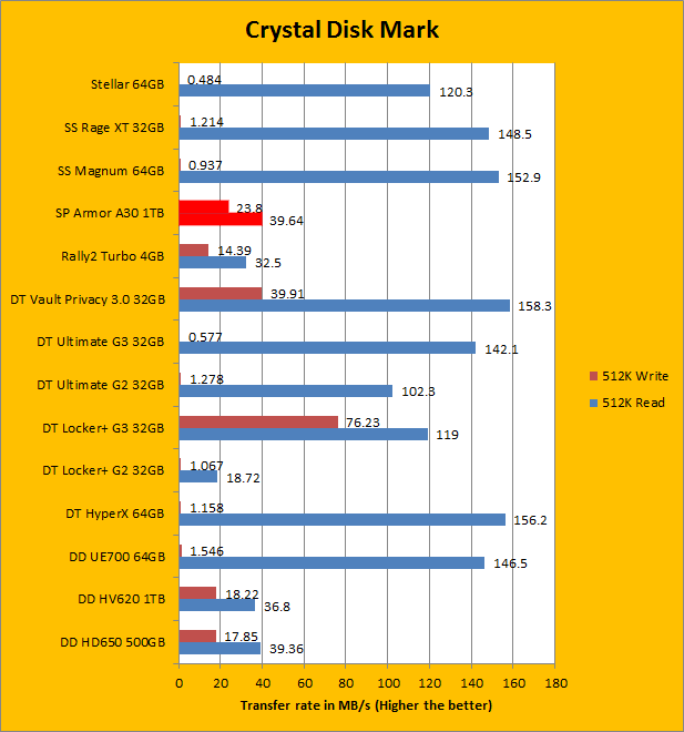 The Silicon Power Armor A30 seems to be topping our charts so far, and now our next benchmark is Crystal Disk Mark. First with the sequential read and write tests, which provided results very similar to both of our previous benchmarks, AIDA64 and ATTO. The next test of 512K write have been known to slaughter most flash drives in terms of performance, bringing them to a screeching halt. Luckily, the Silicon Power Armor A30 still remains above both of ADATA's portable hard drives, as well as write speeds surpassing quite a few USB 3.0 thumb drives. Moving to 4K and 4K QD32 place, which tests for high input/output operations per second (Commonly known as IOPS), the Armor A30 falls back to where we expect most external hard drives to be. Looking at the ADATA DashDrive Durable HD650, the Armor A30 still remains slightly faster, but the margins still remain close at a maximum difference of five megabytes per second.