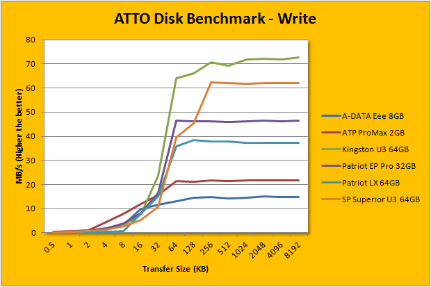 As always, I have included a few oldies on the chart to see how SD cards have evolved in performance over the years. Obviously, if you are looking for the latest and greatest SD card, I don't think a 2GB Class 6 and 8GB Class 10 card is going to be first and second on your list of compared items, so I will spend more time focusing on its closer competitor -- the Kingston SDXC UHS-I U3 64GB. As you can see in our graphs above, the Silicon Power was completely under the Kingston for both read and write, but it is half the price of the rival card. The peak write speed for the Superior SDXC came in at 61.994MB/s according to our tests, which is quite a bit faster than its 45MB/s rated speed. 90% peak write speed is reached at 128KB transfer size, which is the later than the industry standard of 64KB. Coincidentally, the 64KB write speed comes in at 45.353MB/s; maybe that is where they got the speed rating. Meanwhile, the Kingston SDXC peaked at 'only' 72.55MB/s; not quite the 80MB/s rated figure, but close nonetheless. The next closest on the list, Patriot's EP Pro SDHC 32GB, has a peak write speed of 46.589MB/s. Again, consider the price of the cards.
