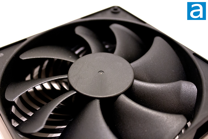 Taking a closer look at the fan blades, you can see some notable difference compared to other fans. If you look carefully, there are three different fan blade geometries for improved subjective noise reduction. All blades curves outward nearing the end of each one. There is a small gap in between each of the fins, having no overlapping fins. The angle each blade sits in comparison to the rotating middle is about 45 degrees. The curvature of the blades is about average. There is a total of nine blades on the impeller. The blades on this fan are quite smooth.