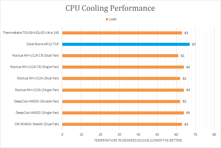 With more than enough time of load on the processor, you can once again see the peak temperatures obtained under each cooler. The SilverStone AR12-TUF produced load temperatures of 67c. From here, you can once again see this was at least 3 degrees warmer than everyone else, and performed the lowest out of the compared air and liquid coolers. Thankfully, we did not observe any thermal throttling, as the Ryzen 7 3700x boosted to the same boost frequencies under the SilverStone AR12-TUF. This shows we still had some headroom under this cooler.